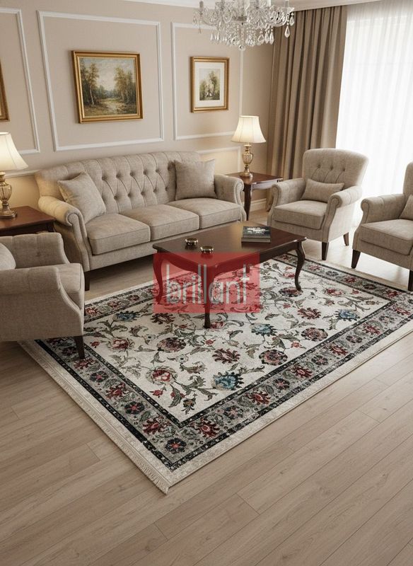 BEJ-GRİ Geleneksel Eskitme Motifli SAÇAKLI Klasik Kaymaz Taban Halı